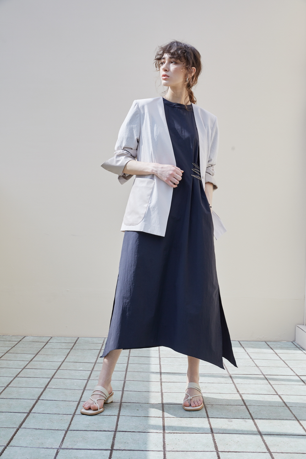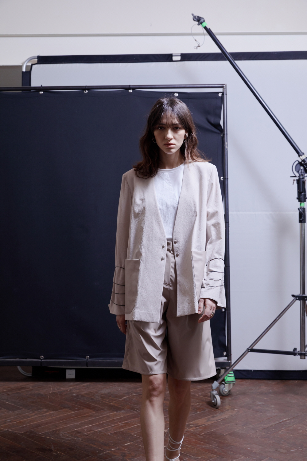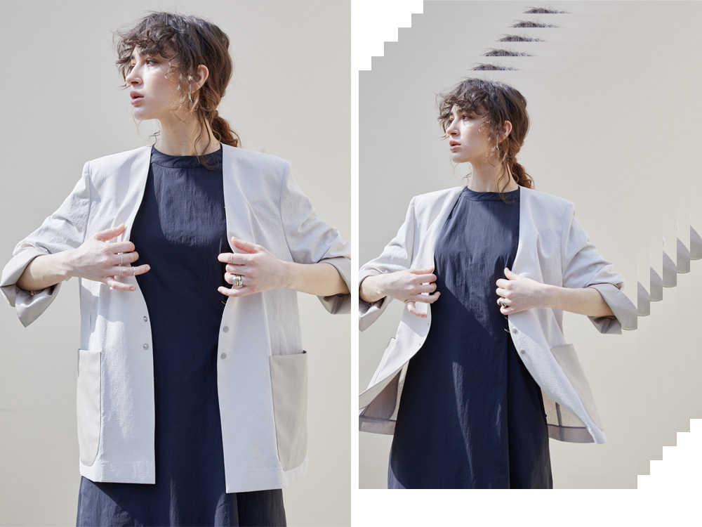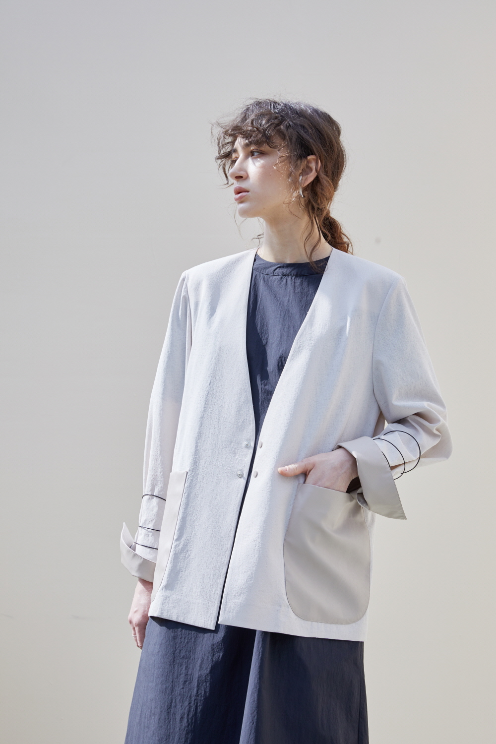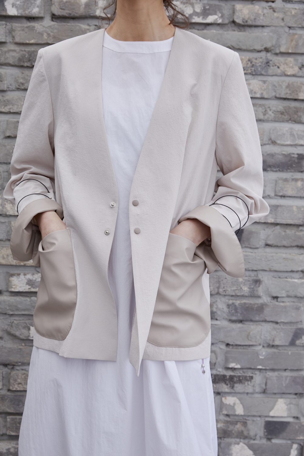 안감이 없는 홑겹 자켓이며, 워셔블 비건 레더로 포켓과, 소매 안쪽에 배색 포인트를 주었습니다. 소매 스트링은 탈부착이 가능한 디테일이며, 루즈한 핏으로 디자인 되어 여름철 쉽게 코디할 수 있게 디자인 되었습니다. 아주 얇은 어깨패드가 들어가 있어 자연스러우면서도 스타일리쉬한 핏으로 연출됩니다.