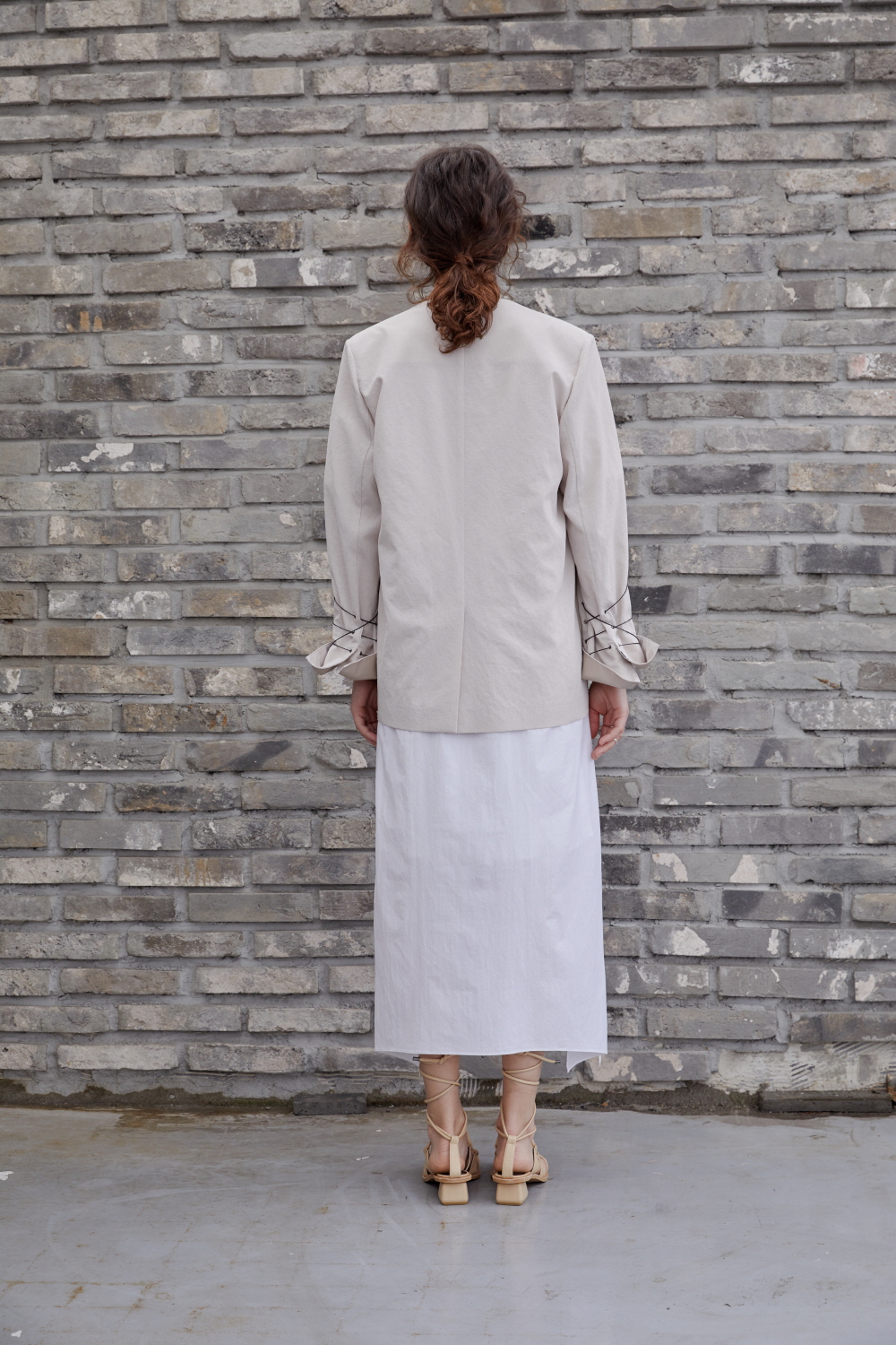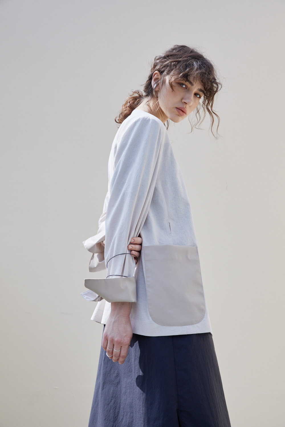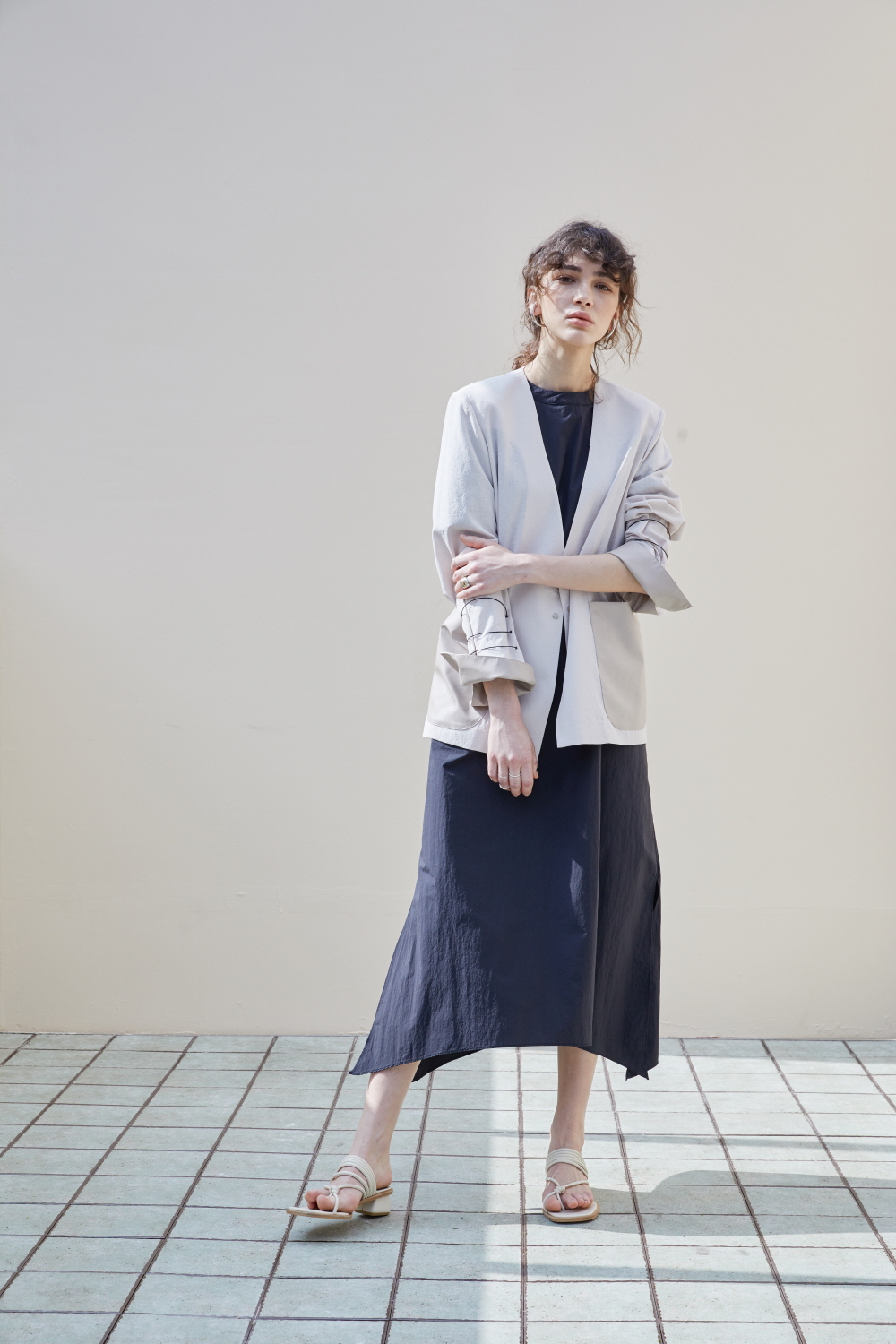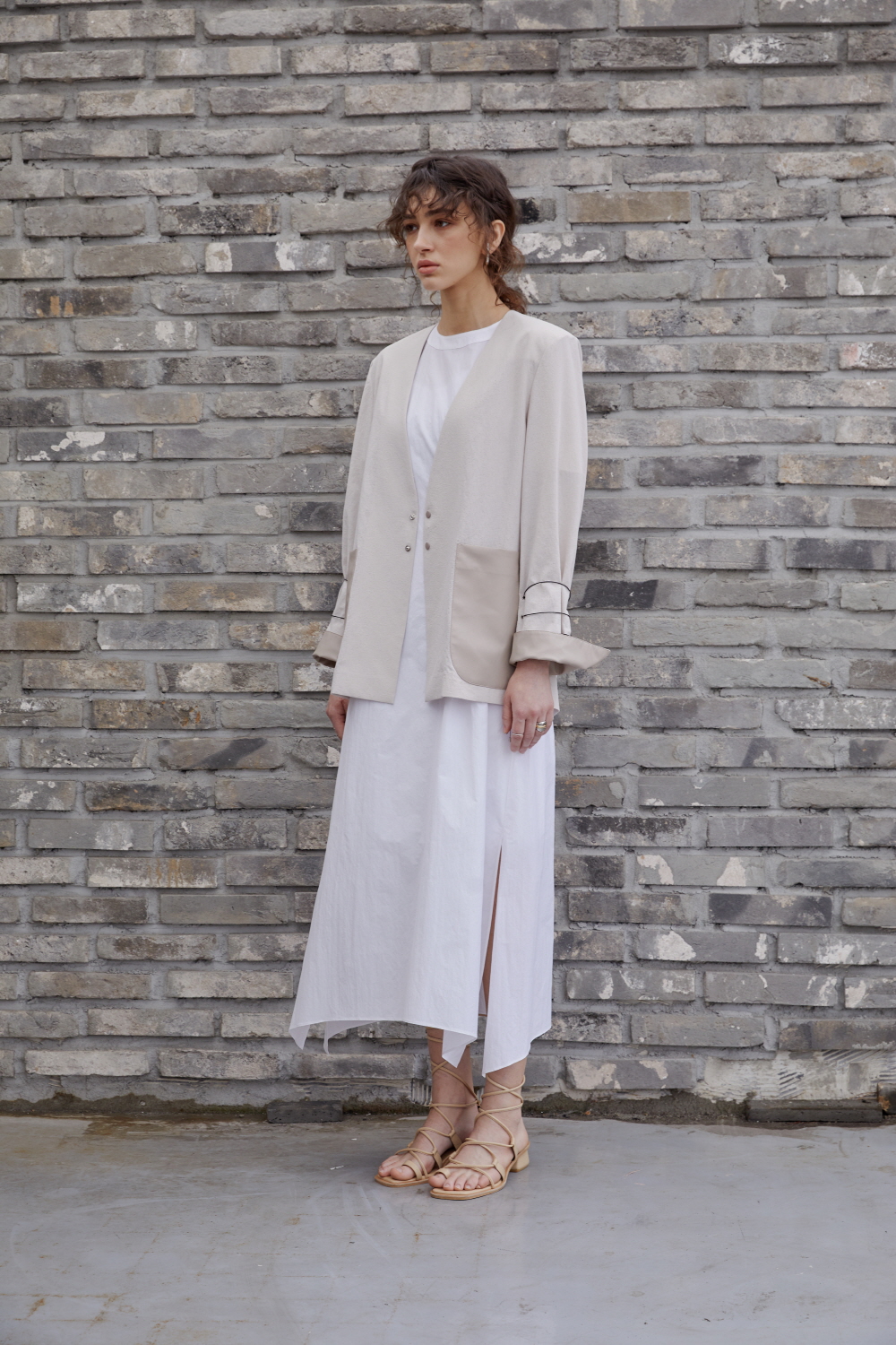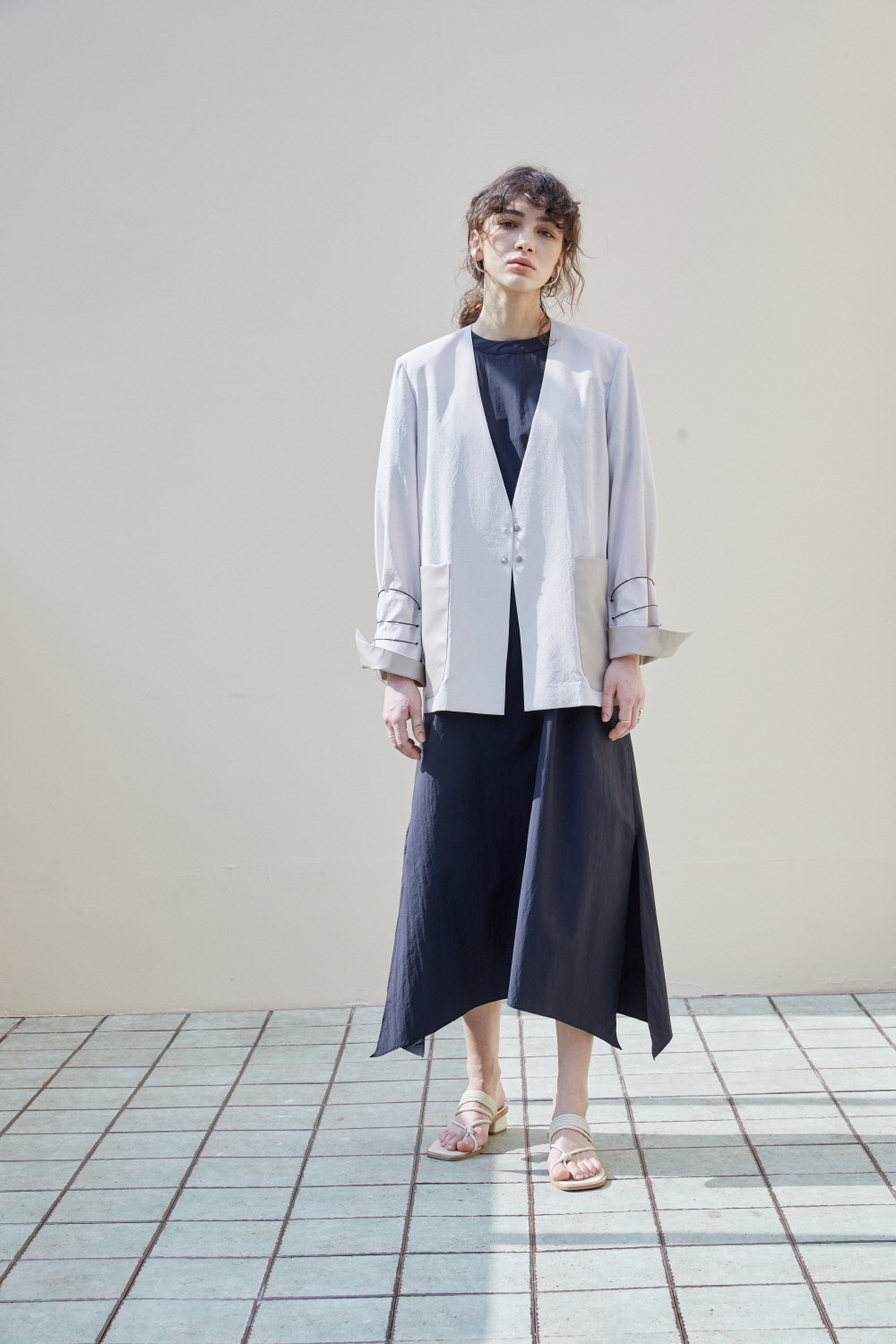 안감이 없는 홑겹 자켓이며, 워셔블 비건 레더로 포켓과, 소매 안쪽에 배색 포인트를 주었습니다. 소매 스트링은 탈부착이 가능한 디테일이며, 루즈한 핏으로 디자인 되어 여름철 쉽게 코디할 수 있게 디자인 되었습니다. 아주 얇은 어깨패드가 들어가 있어 자연스러우면서도 스타일리쉬한 핏으로 연출됩니다.