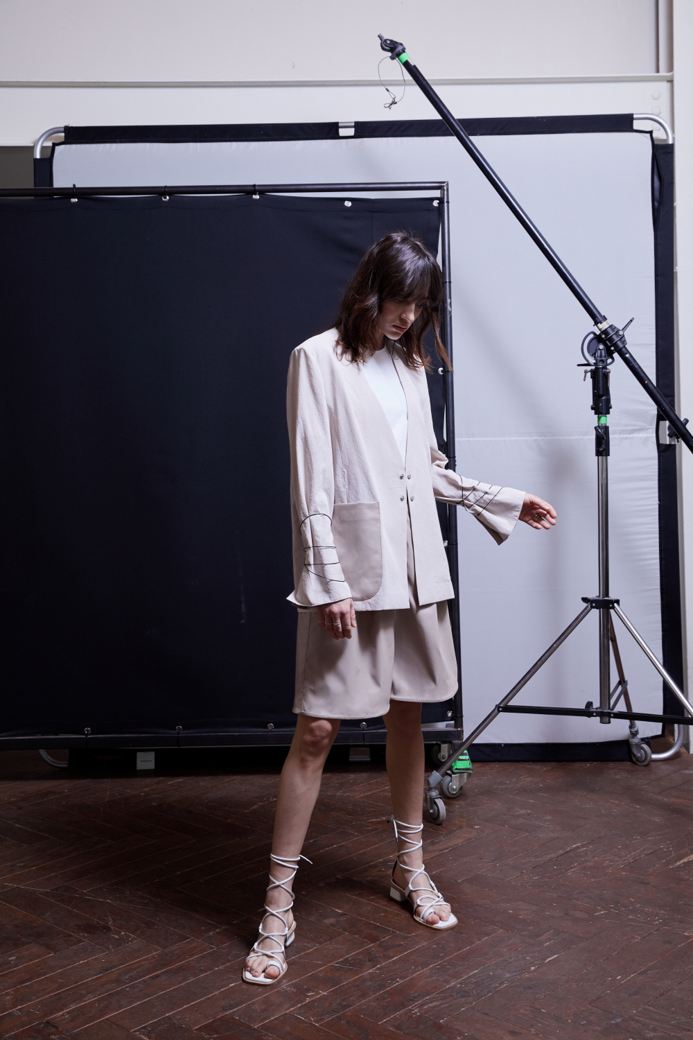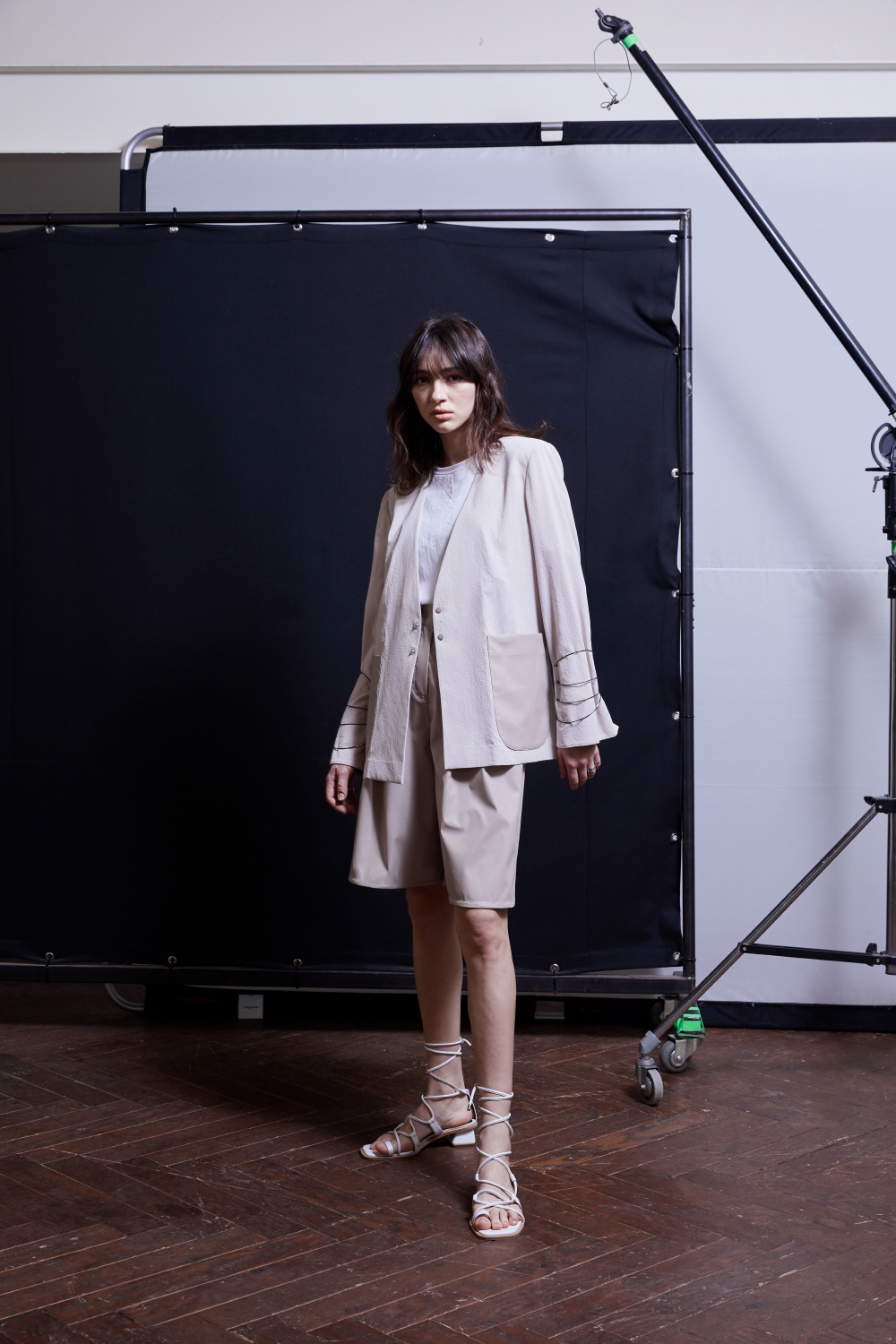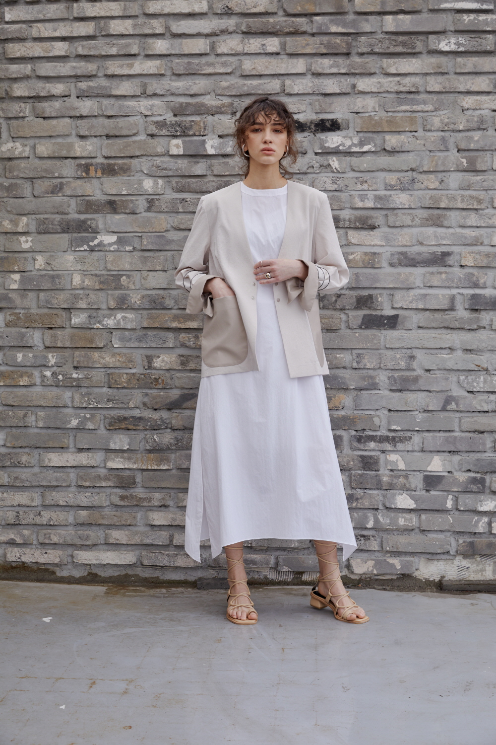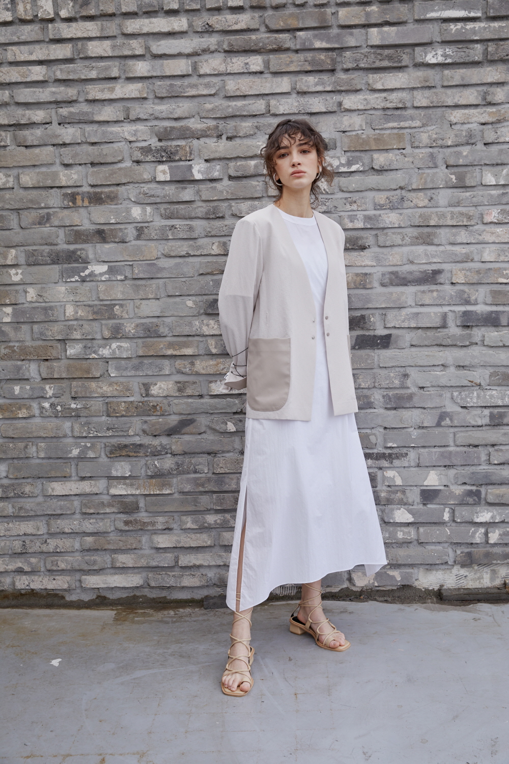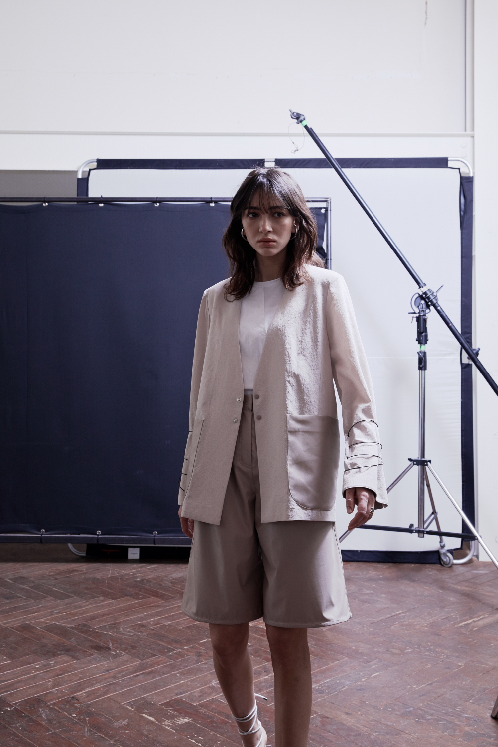 안감이 없는 홑겹 자켓이며, 워셔블 비건 레더로 포켓과, 소매 안쪽에 배색 포인트를 주었습니다. 소매 스트링은 탈부착이 가능한 디테일이며, 루즈한 핏으로 디자인 되어 여름철 쉽게 코디할 수 있게 디자인 되었습니다. 아주 얇은 어깨패드가 들어가 있어 자연스러우면서도 스타일리쉬한 핏으로 연출됩니다.