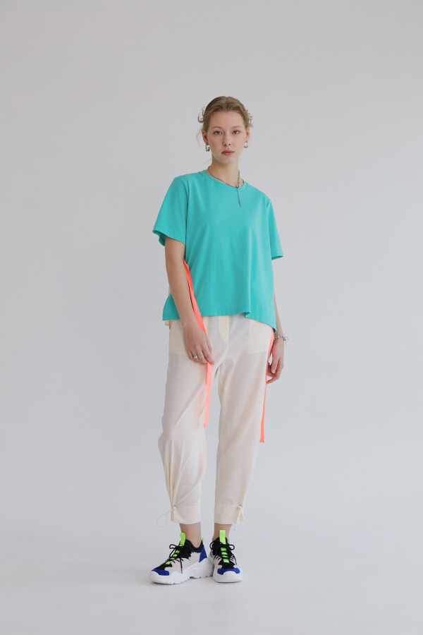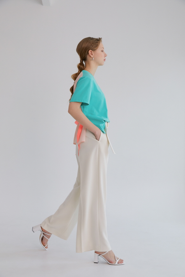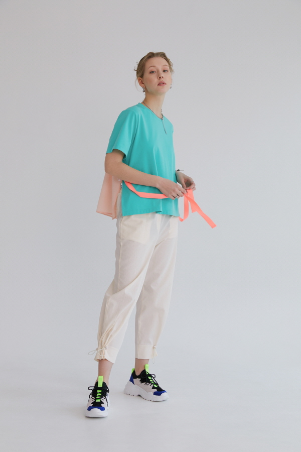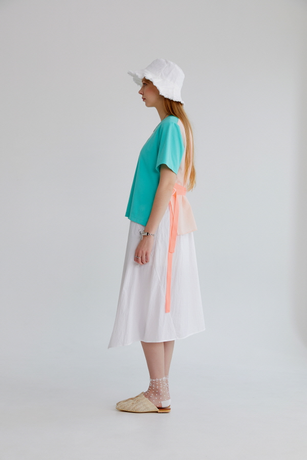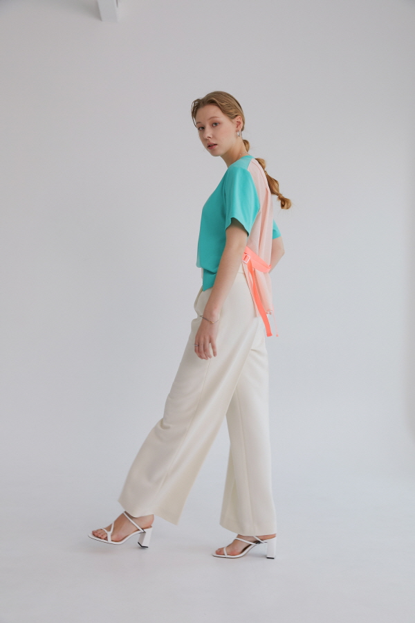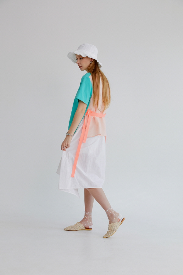 뒤쪽 리본테이프 컬러가 포인트가 되며, 트임으로 생기는 앞판의 자연스러운 드레이프성이 매력적인 디자인입니다.