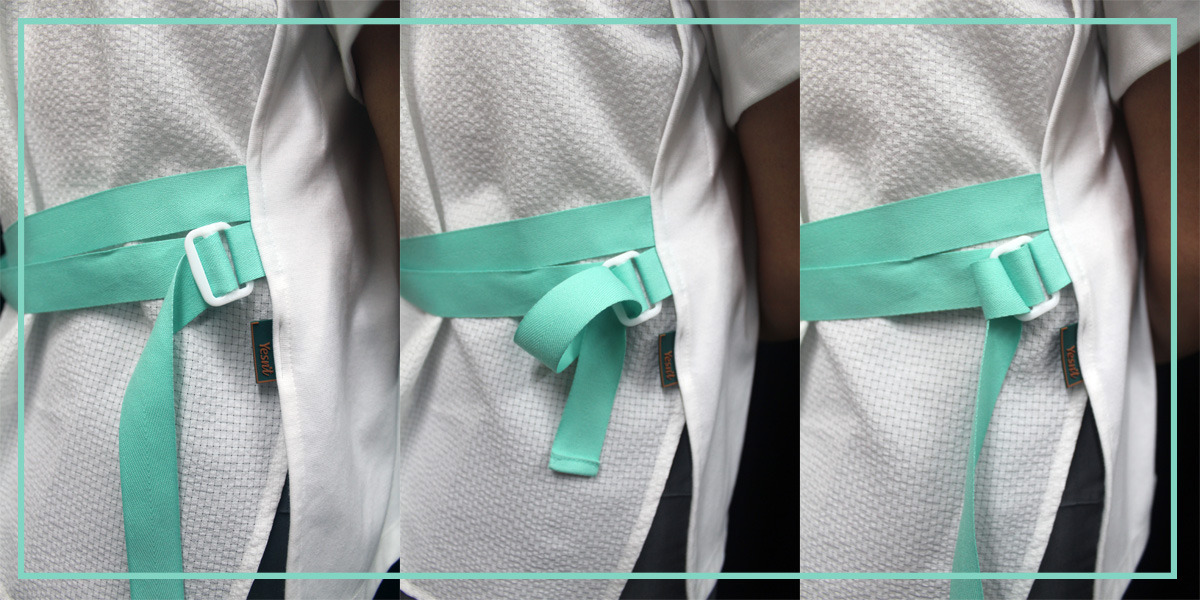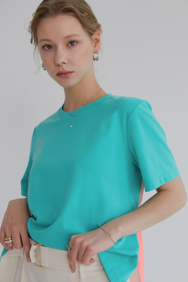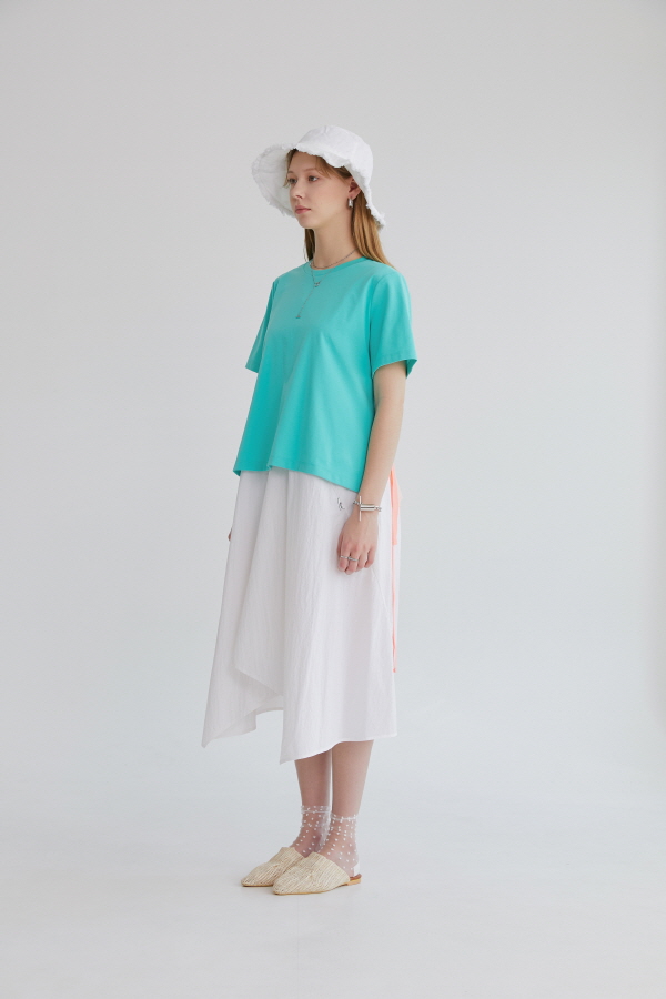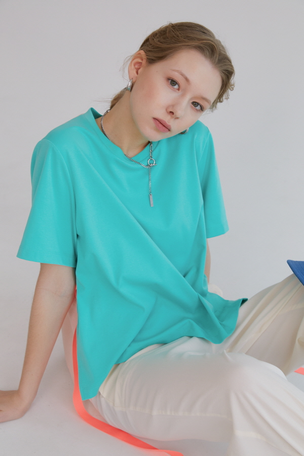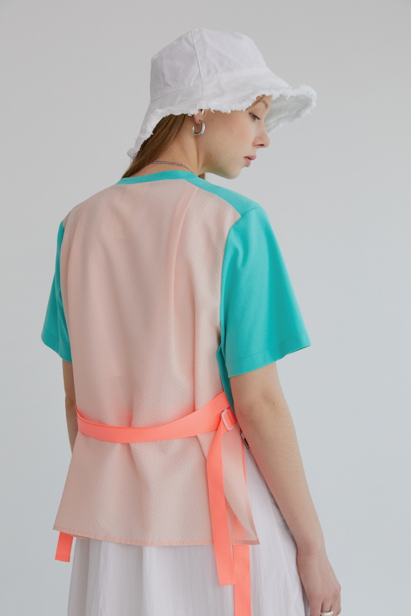 뒤쪽 리본테이프 컬러가 포인트가 되며, 트임으로 생기는 앞판의 자연스러운 드레이프성이 매력적인 디자인입니다.