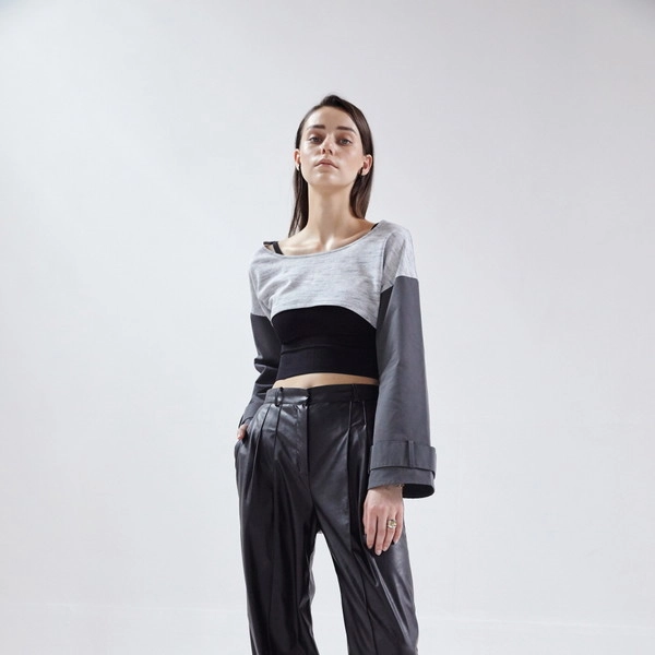 긴팔 볼레로와 반팔 티셔츠를 레이어드해서 착용하는 제품으로, 트렌치 코트를 레이어드 하여 착용한 듯한 느낌을 주는 디자인입니다.