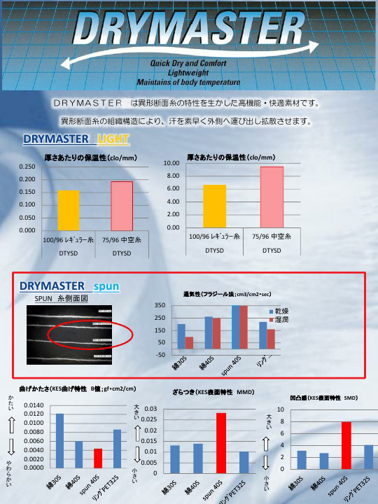 일본 수입 소재인 Drymaster의 원사는 실 표면상에 미세한 홈을 다수 만들어 모세관 작용으로 습기나 땀을 빠르게 흡수, 건조합니다. 흡습속건 기능 외에도 항필링성, 이지케어 특징이 있는 소재입니다.